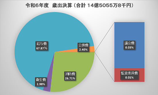 歳出では、歳出グラフのとおり消防費と給与費が最も大きく、消防費は主に消防本部、各消防署(支署)の活動経費に充てられます。 |